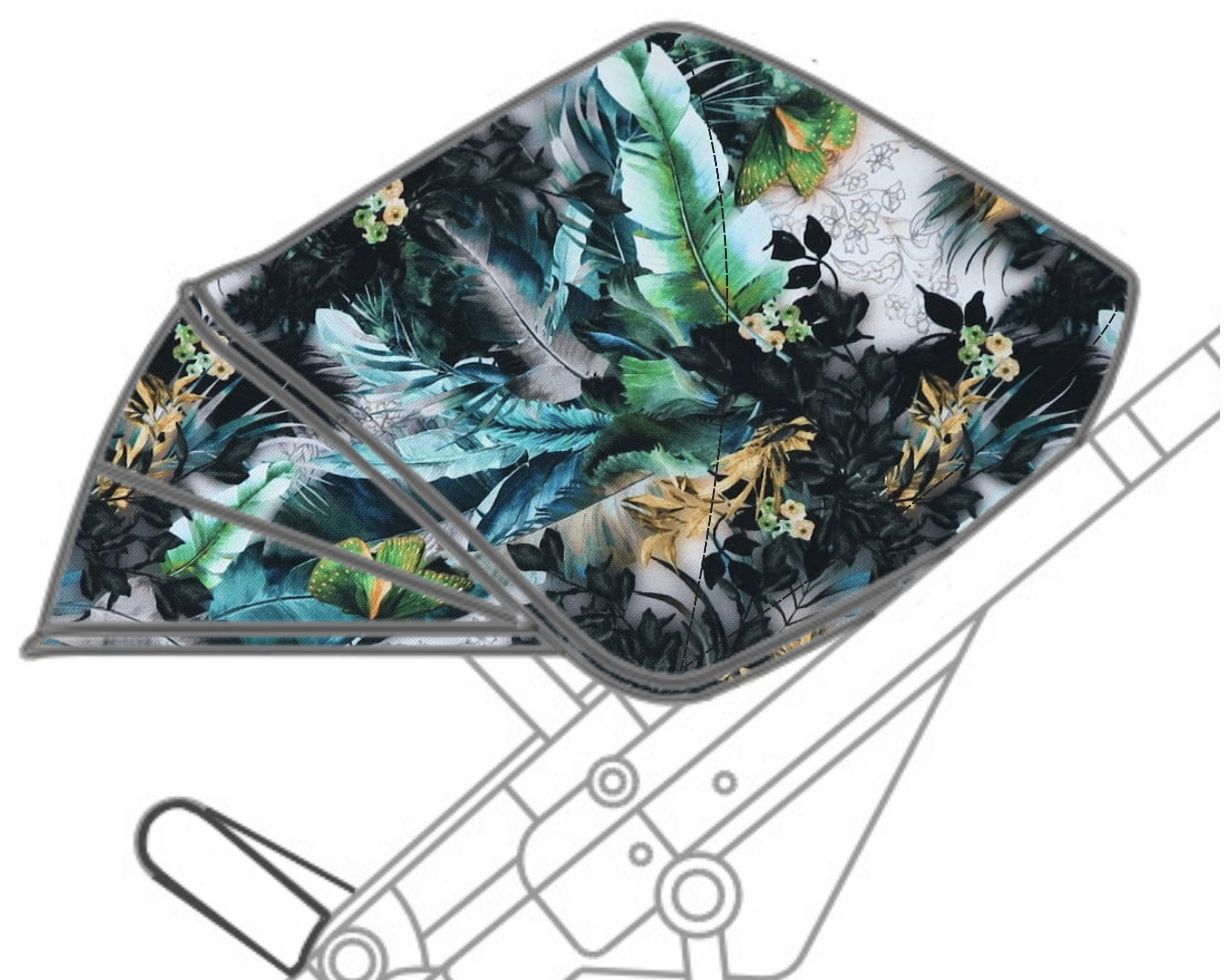 na podnóżku po obu stronach jest tkanina wodoodporna w kolorze / wzorze identycznym jak budka